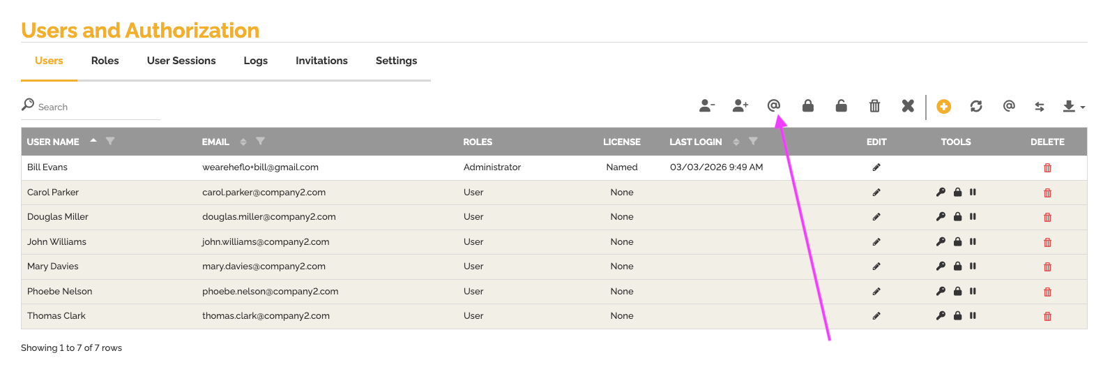 - En la parte superior de la tabla, haga clic en el ícono @ (Cambiar Dominio).