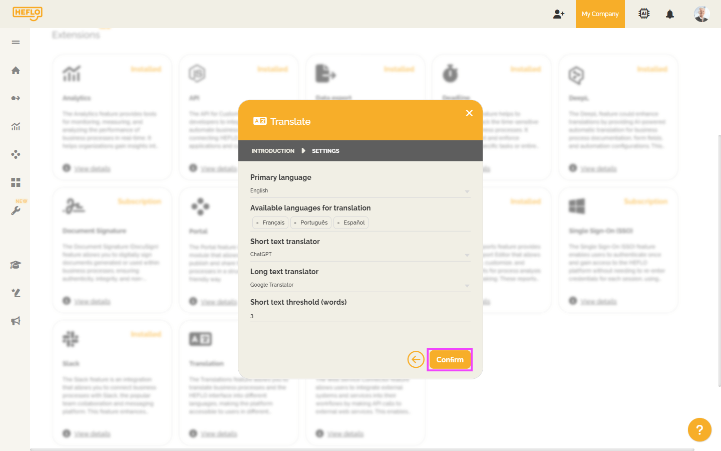 - Traductor: Por defecto, HEFLO utiliza Google Traductor. Sin embargo, si tiene una cuenta de ChatGPT vinculada a su entorno HEFLO, puede seleccionar esta herramienta para realizar traducciones cortas o largas.