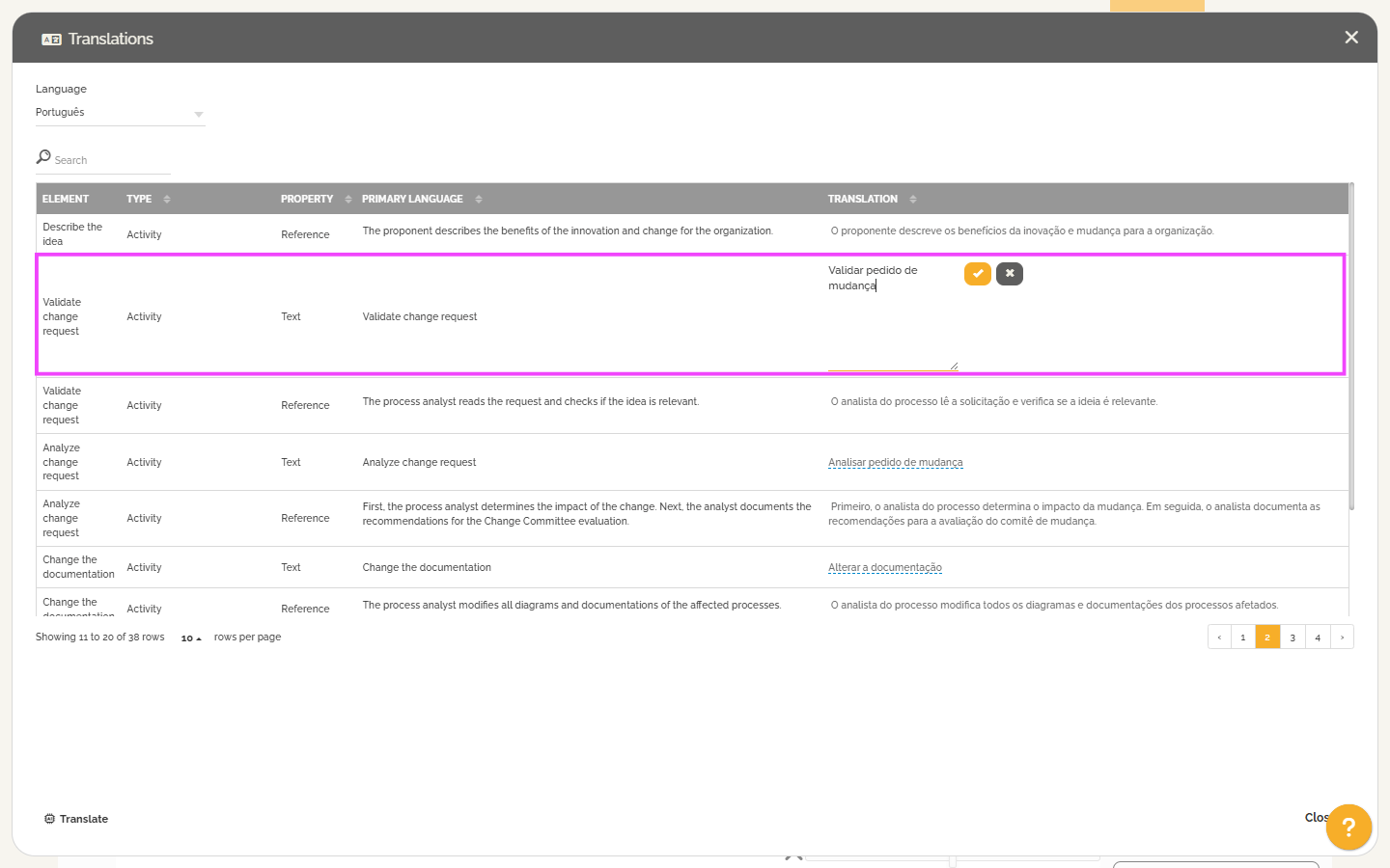 HEFLO también le permite traducir o actualizar la traducción de un elemento específico, ya sea parte de sus procesos o formularios.