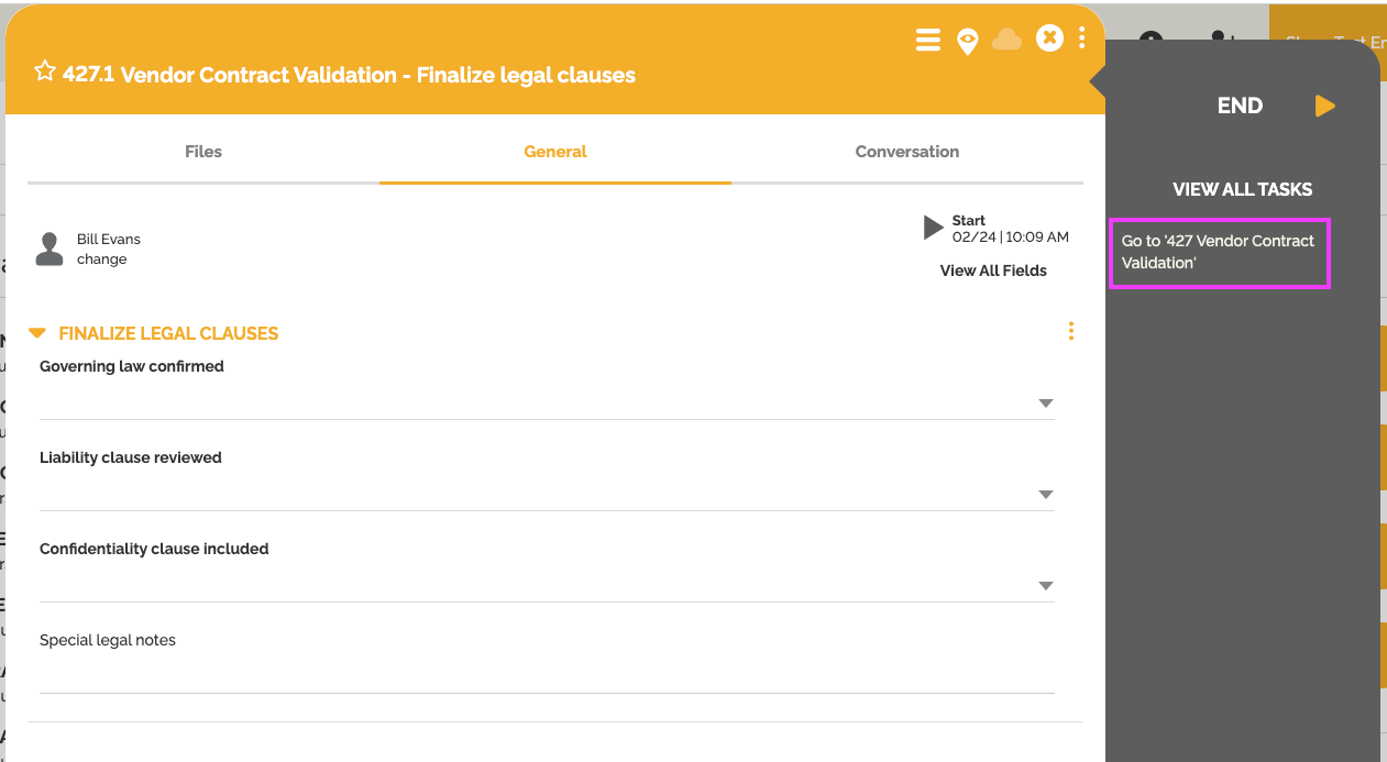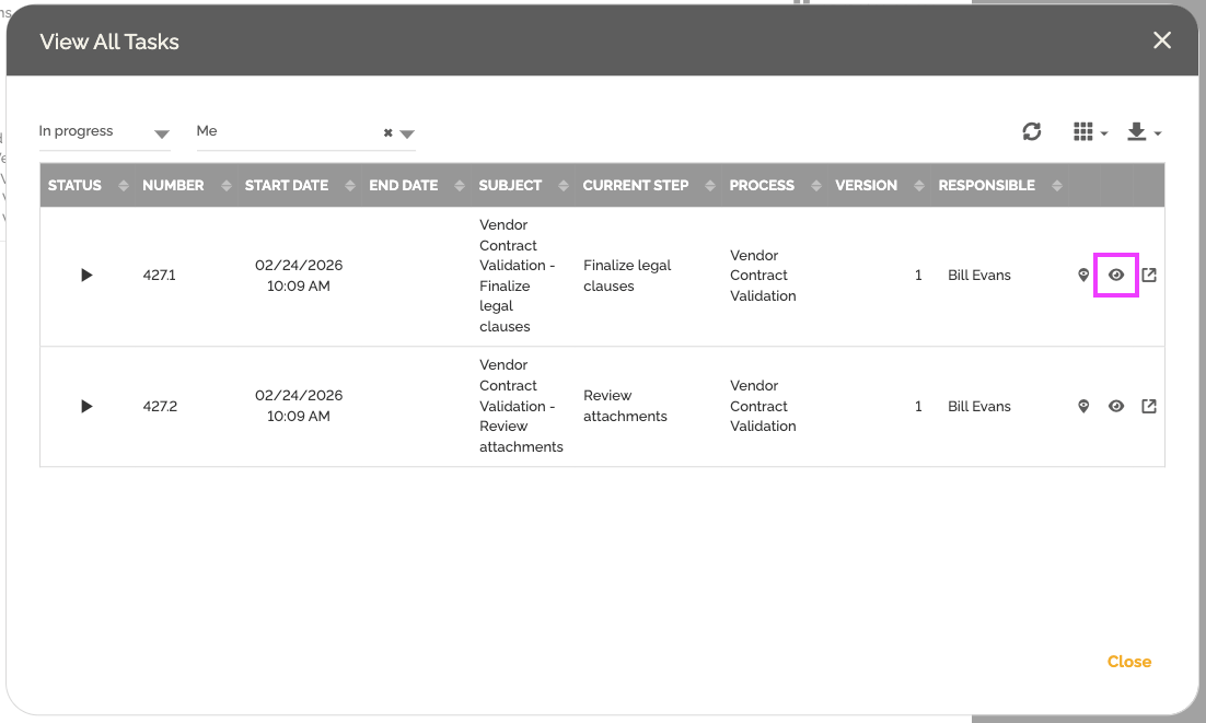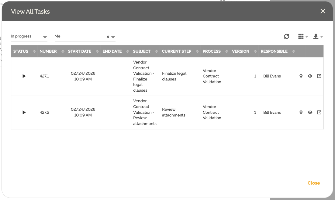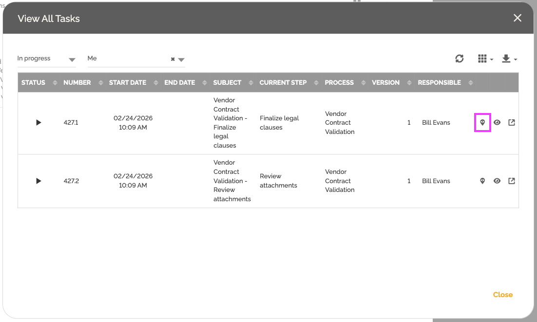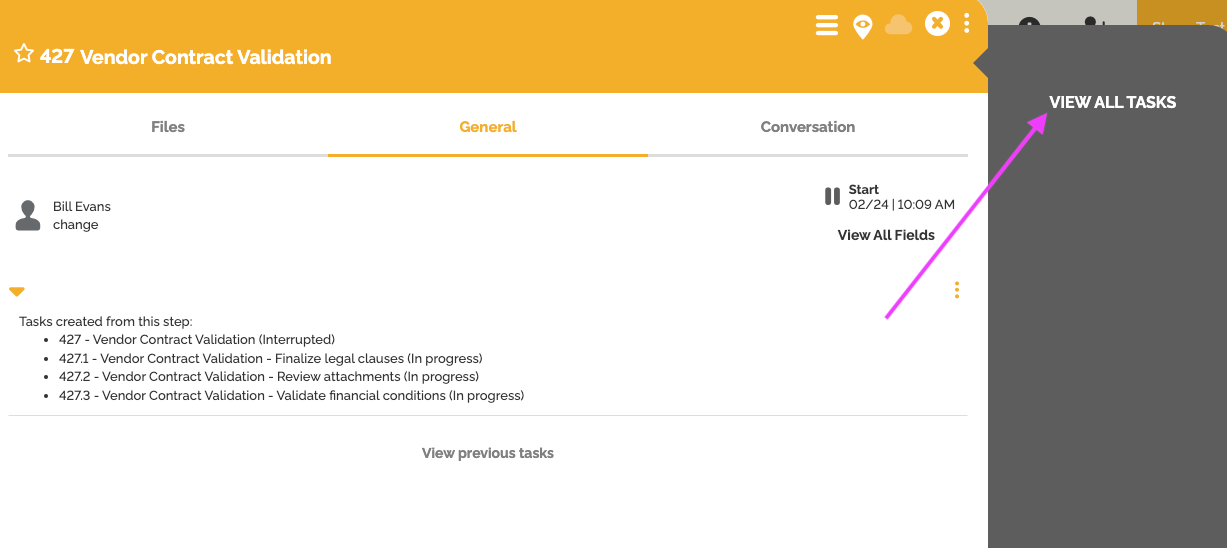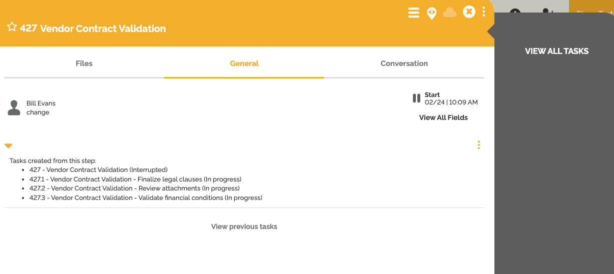 Quando uma instância de processo atinge uma etapa que gera múltiplas tarefas, uma nova opção é exibida no lado direito da janela da instância: “Visualizar Tarefas Relacionadas”.