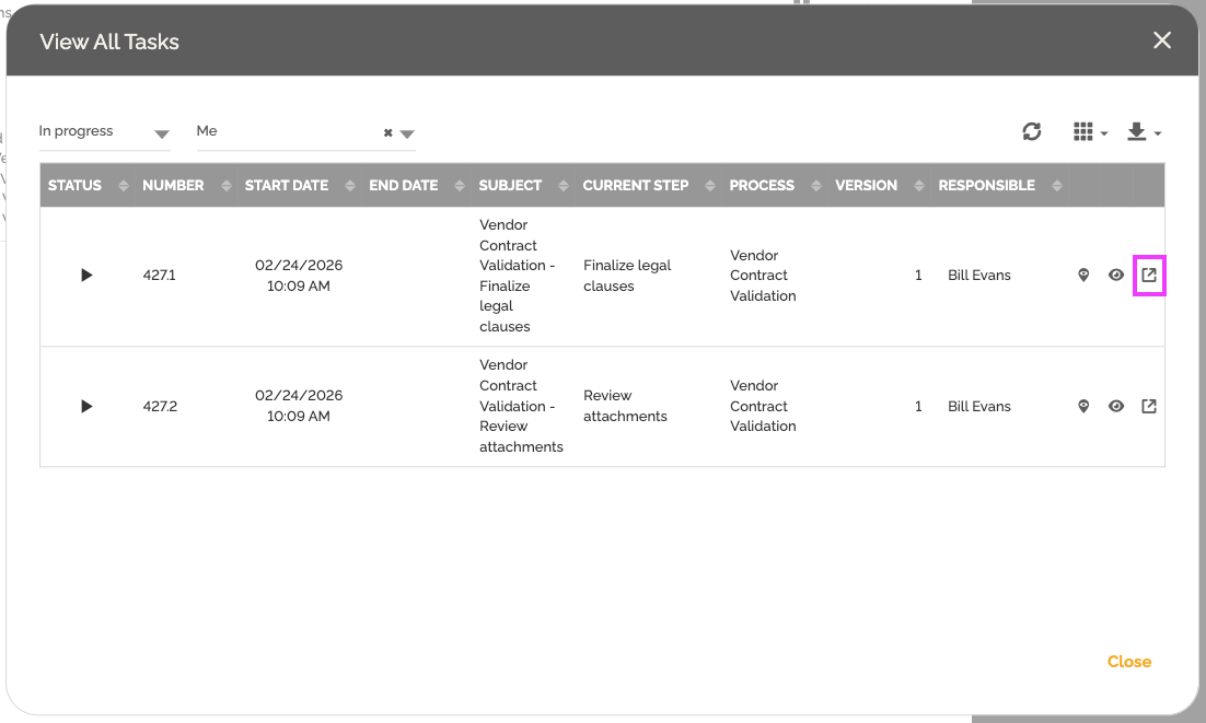• Abrir a instância selecionada e exibir as informações da tarefa atual.