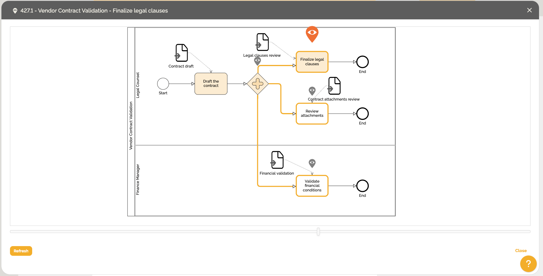 • Localizar a tarefa da instância selecionada no mapa do processo.