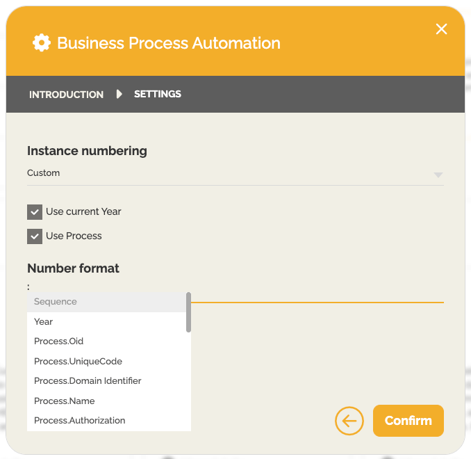 - Exemplo de personalização: Ano atual – Nome do processo – Sequência.