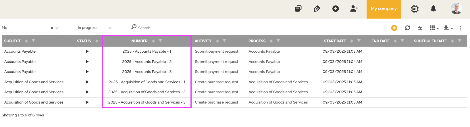Este artigo explica como personalizar o número das instâncias de processo (work items) vinculadas a um ambiente. Por padrão, a numeração é sequencial (1, 2, 3…). Você pode adicionar informações como o ano atual e o nome do processo para diferenciar melhor suas instâncias na lista de tarefas.