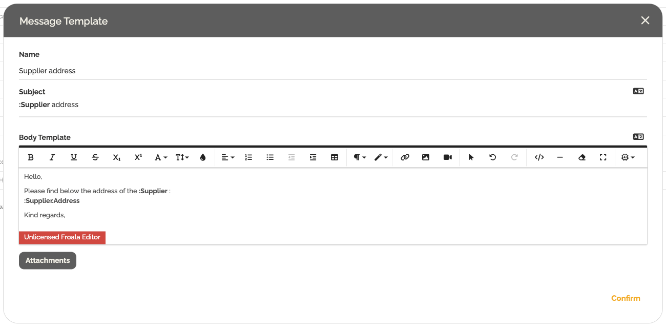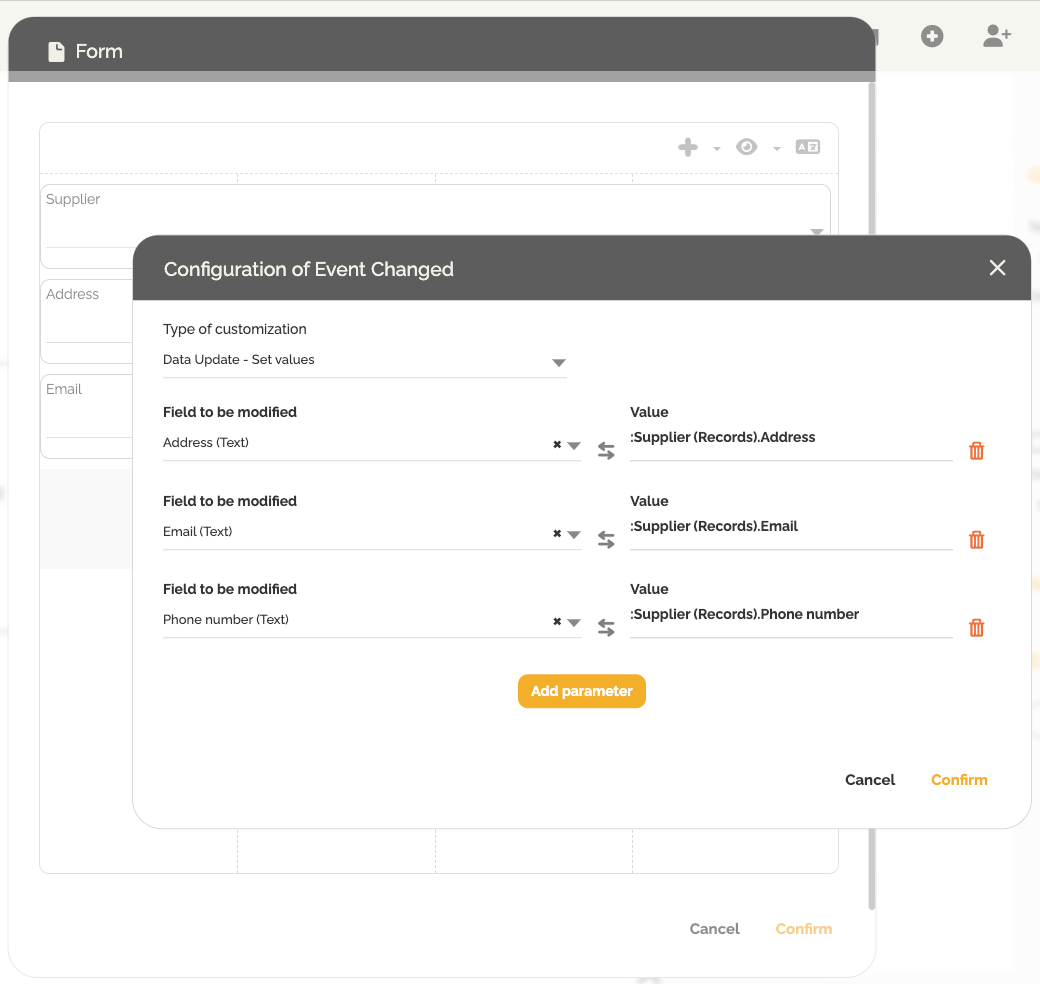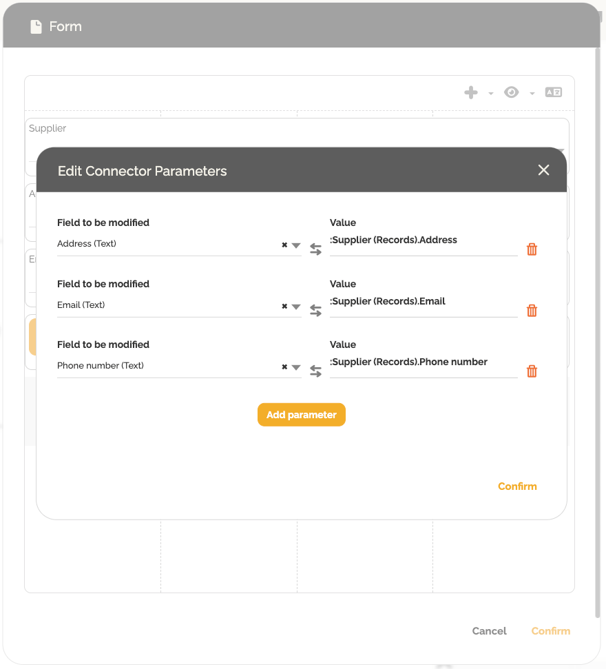 - Crie mapeamentos entre as propriedades do registro (por exemplo, Fornecedor.Endereço, Fornecedor.E-mail) e os campos de texto no formulário. Para selecionar uma propriedade do registro, digite “:” e, em seguida, escolha a propriedade desejada entre as disponíveis para esse registro.