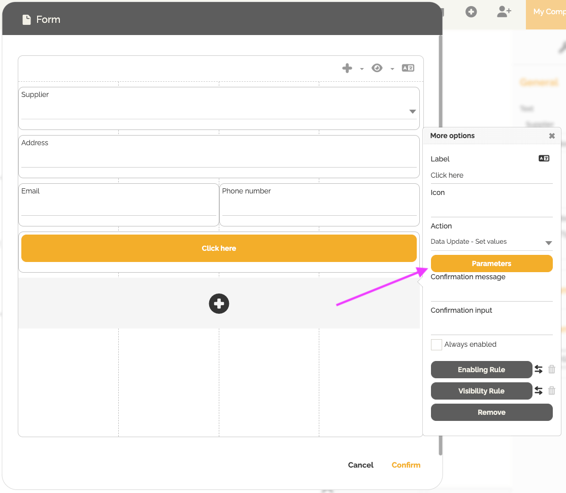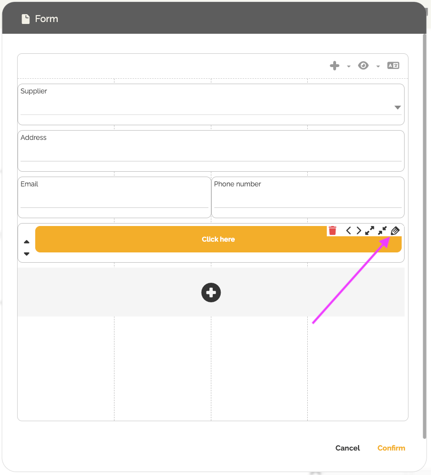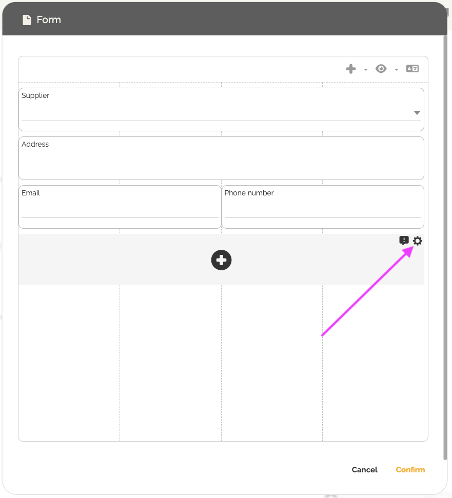 - Clique em uma área vazia do formulário e, em seguida, clique no ícone de engrenagem para adicionar um botão.