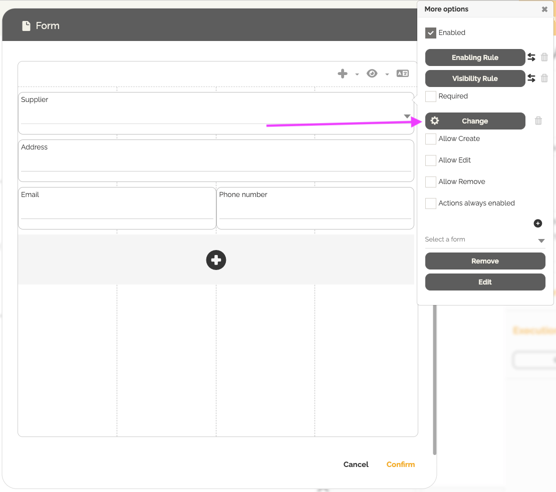 - Selecione o campo do tipo registro (por exemplo, Fornecedor) no seu formulário.